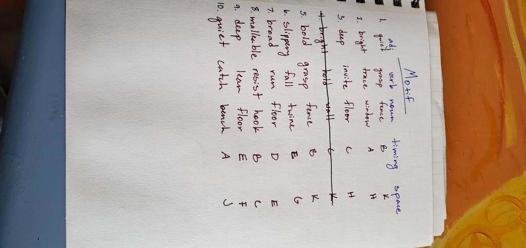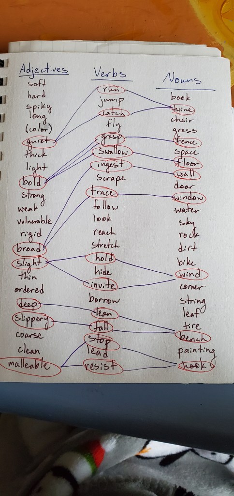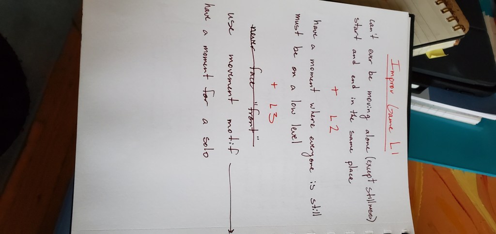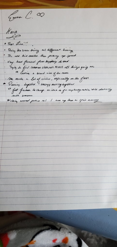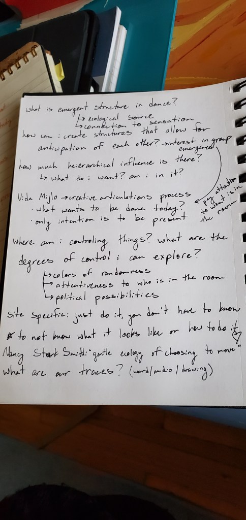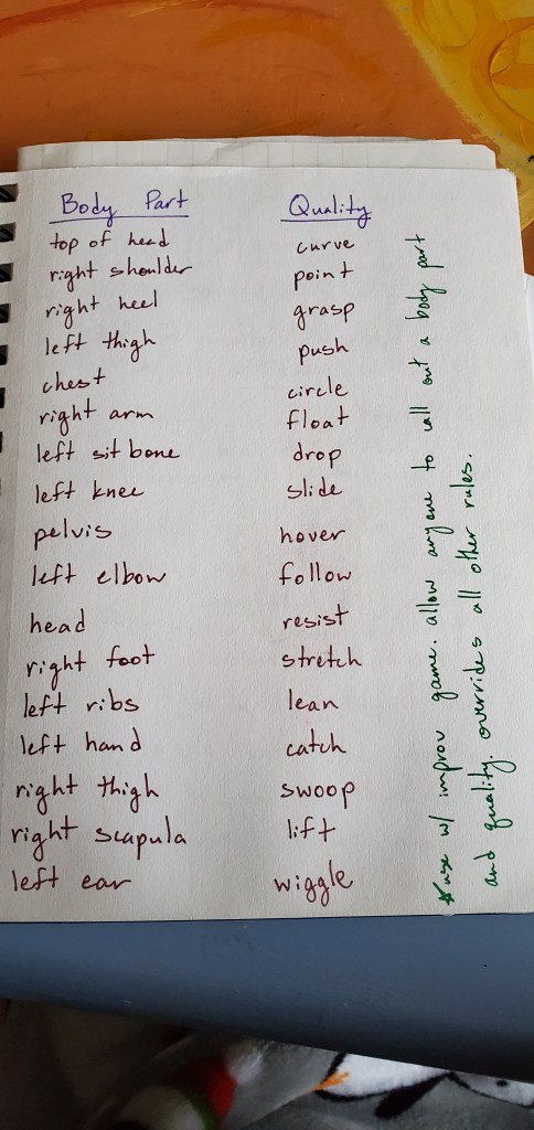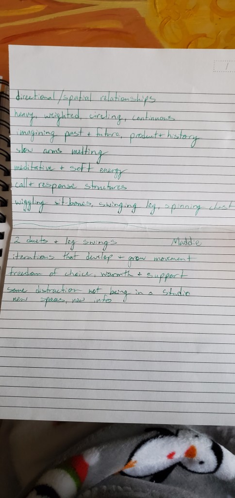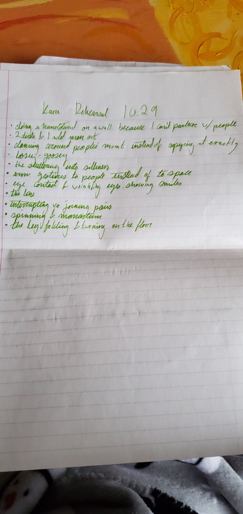 I started out with structures that I was already familiar with that I could use to create material quickly and with little effort. I used randomized nouns, verbs, and adjectives, as well as spatial designs and timing patterns to create a score for a phrase of movement. My original plan was that I was going to be the objective choreographer and all of the dancers would help me generate material, so while the score was randomized, I still had a lot of control over the process. I also created a set of random body parts from which to make duets and a random list of body parts and qualities that could be used to make another phrase. For the first few rehearsals, we entered the space together and checked in using an activity I borrowed from Gina Hoch-Stall: going around in a circle, each person does a movement that feels good in their bodies and everyone else mirrors them while they answer a question about their day or their state of mind. Then, I would pick up my notebook and lead them through one of the movement generating processes that I had planned out. We created a solo for everybody that was based on the same score so that while each person’s movement was different, there was something really striking about everyone moving with the same nuances in timing and level in space. We also created three duets this way off of the same score so each one was unique but used the same inspiration of trading energy while not touching. These chance procedures were really fruitful for movement generation and created some really interesting results without requiring me to envision it first.
