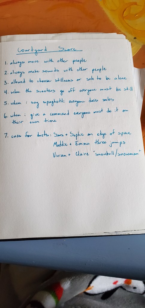 At this point I was able to have a meeting with my advisor, Norah Zuniga-Shaw, who challenged me to go beyond my own preconceptions of the process. With her guidance, I decided to start changing how I was part of the group and redistributing some of the control to other members. This is where the project started to shift from creating material, to creating experiences. We experimented with going outside and developing scores as a group rather than me writing them down beforehand. We even changed the use of some of my written scores and created new rules to govern our experience. Going outside introduced new factors from the environment around us into the process. We used the clock tower to time our improvisation at one point and during another iteration we used the alarm on a Lime Scooter to trigger pauses in our dance. This opened me up to the possibilities that the environment can contribute to an experience.