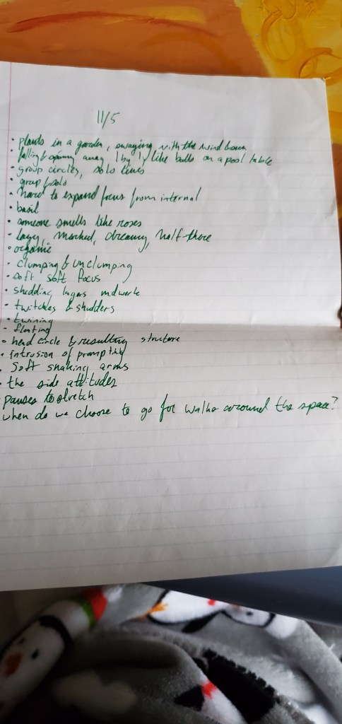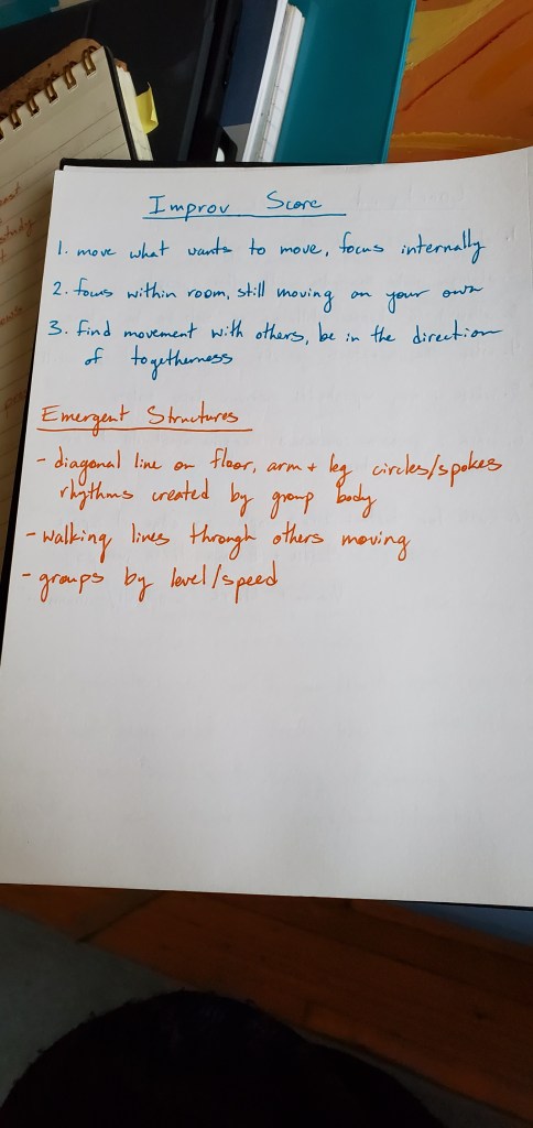 The last few rehearsals we had to come back inside because it was getting colder and there was one last part of the process that we hadn’t spent much time with, but that seemed to be an integral part of what was happening. One of the rules that had been constant is that “nobody can ever be alone.” If one person starts moving, someone else needs to move with them and you can never be moving alone, with a few exceptions depending on the score. It was the responsibility of the group as a community to make sure that nobody was ever alone. At the core of this was the basic idea of “moving what wants to be moved” which is usually what started off the improvisation. To explore this idea deeper, for the last three rehearsals we did a 40 minute improvisation. For the first 10 minutes we would focus on only moving what wanted to be moved in our bodies and keep our focus internal. For the second 10 minutes we would continue moving only what wanted to be moved but we would allow our focus to extend into the room and be aware of what other people were doing. For the last 20 minutes we would “move in the direction of togetherness” by allowing ourselves to follow the rule that had been used in previous experiments but not being too precious about it. This process was the most healing and enjoyable to take part of. As a group everybody came out of it feeling connected to each other and there were always some really beautiful structures that emerged from the improvisation without us having to force anything. This part of the process opened up the possibilities that little control and very few guidelines could provide to a group improvisational experience.
