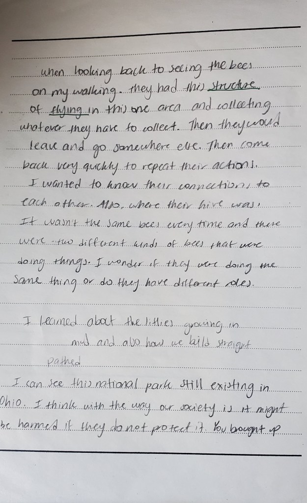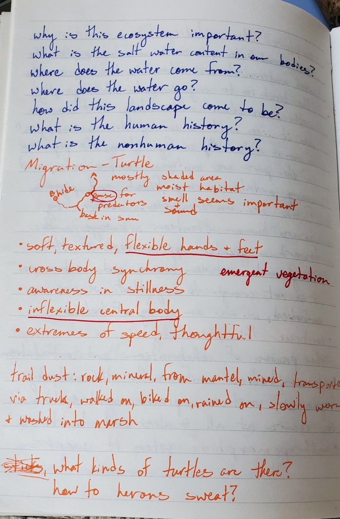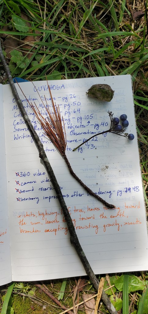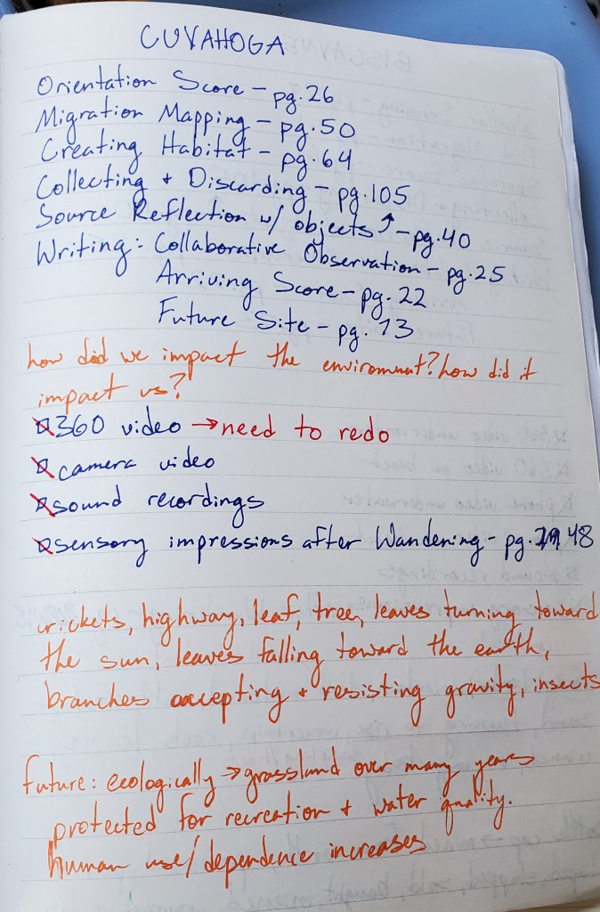 Beaver Marsh is located in Cuyahoga National Park which was about a two hour drive from Columbus. I traveled with two of my dancers: Madeline Denman and Rosely Polanco. When we arrived I used about an hour to take some sound recordings and videos of the marsh while Maddie and Rosely wandered around on their own and got to know the location better. Following the hour of digital collecting on my part we found a grassy area off of the main walking path to enjoy the rest of the scores. This site was unique in that there was heavy foot traffic moving through it at all times. Cuyahoga National Park is a very fragmented park that is long and thin and you are often driving through neighborhoods to get to the locations within the park. This sparked a lot of conversation for us around the benefits of having protected “natural” areas near where we live as well as the possible drawbacks. It was a great example of how what we call “natural” often isn’t as separated from our human history as we would like to think.