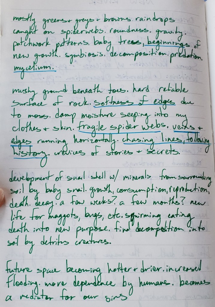New River Gorge National Park is the newest national park in the country and protects a very diverse set of ecosystems within the temperate rainforest biome of Appalachia. I traveled with three of my dancers: Madeline Denman, Sydney Lettau, and Allison Smith. This time it was about a four hour drive and we spent two days total in West Virginia. Upon arrival at the park I, once again, took an hour to collect sound recordings and video of the site while Maddie, Sydney, and Allison explored the area for themselves. When we came back together we talked a lot about the complex history of this place and West Virginia in general. While there was less foot traffic than at Beaver Marsh, there were still very clear evidences of human use, including an abandoned mining town and railroad that you could see from the overlook. It had just finished raining when we arrived so all around us were the sound of water droplets filtering through the canopy and down to the soil. It was humid and warm and slippery. The Gorge has a lot of exposed rock walls where you can see the layers of history that make up the soil and provide a natural water filtering system as well as the coal that West Virginia is known for. On our way home the next day, we stopped thirty minutes away from New River Gorge at Kayford Mountain, one of the last remaining mountains within an area that has been devastated by mountaintop removal and, looking out over the flattened tops around us, we talked about the complexity of human needs and what we lose and gain from practices that destroy natural systems.