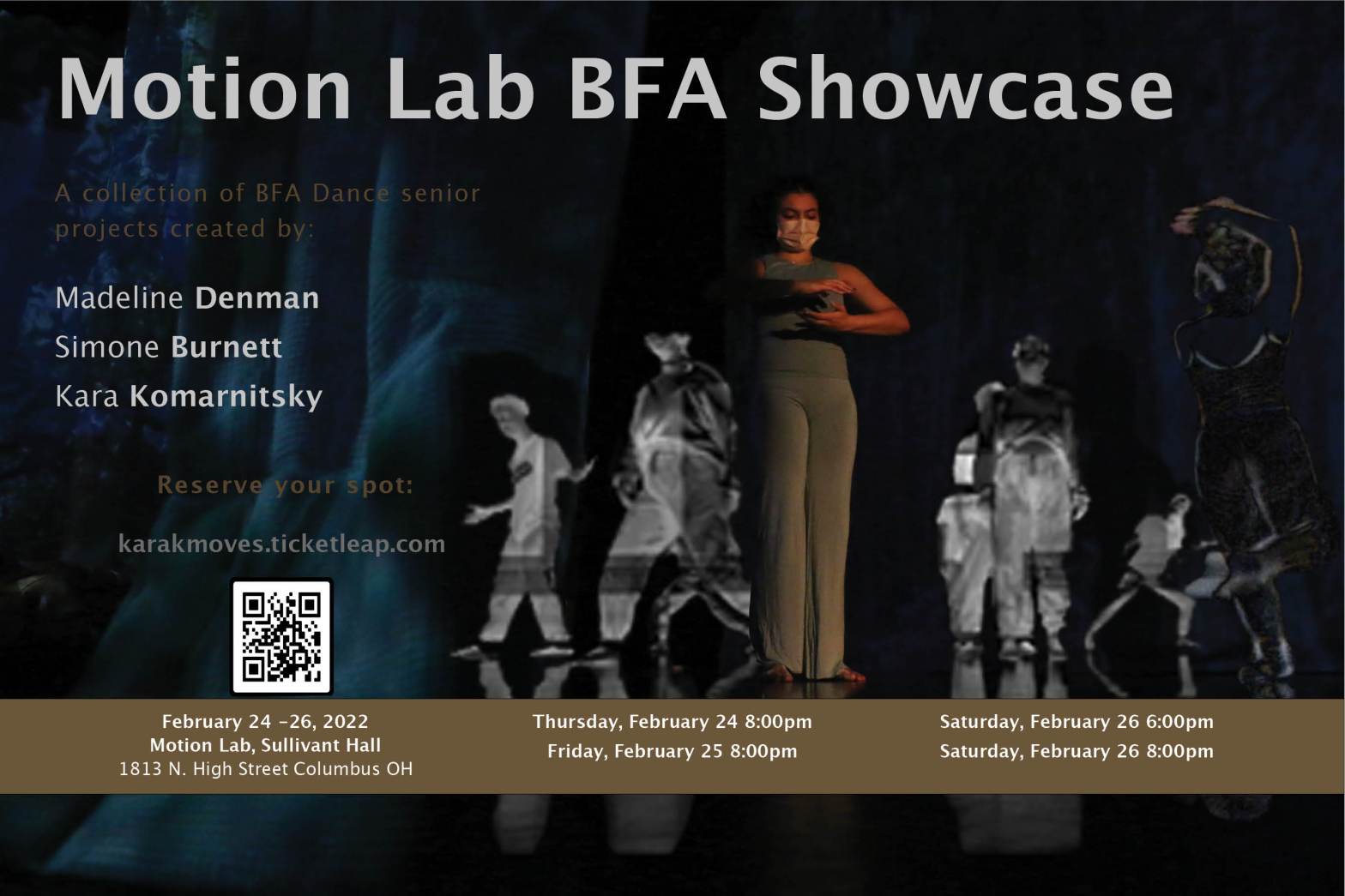 Title: Interconnect Direction and Choreography: Kara Komarnitsky Performance and Movement Generation: Sydney Lettau, Allison Smith, Vivian Corey, Madeline Denman, Heather Lyu, Rosely Polanco, Ava Raczkowski, Emma Carver Music: Michael Wall, Seth Alexander, Hotel Neon Advisors: Norah Zuniga-Shaw, Alex Oliszewski Lighting Design: Oded Huberman Production Support: Katie O’Loughlin Note: This performance will guide you through threeContinue reading “BFA Thesis: Performance”